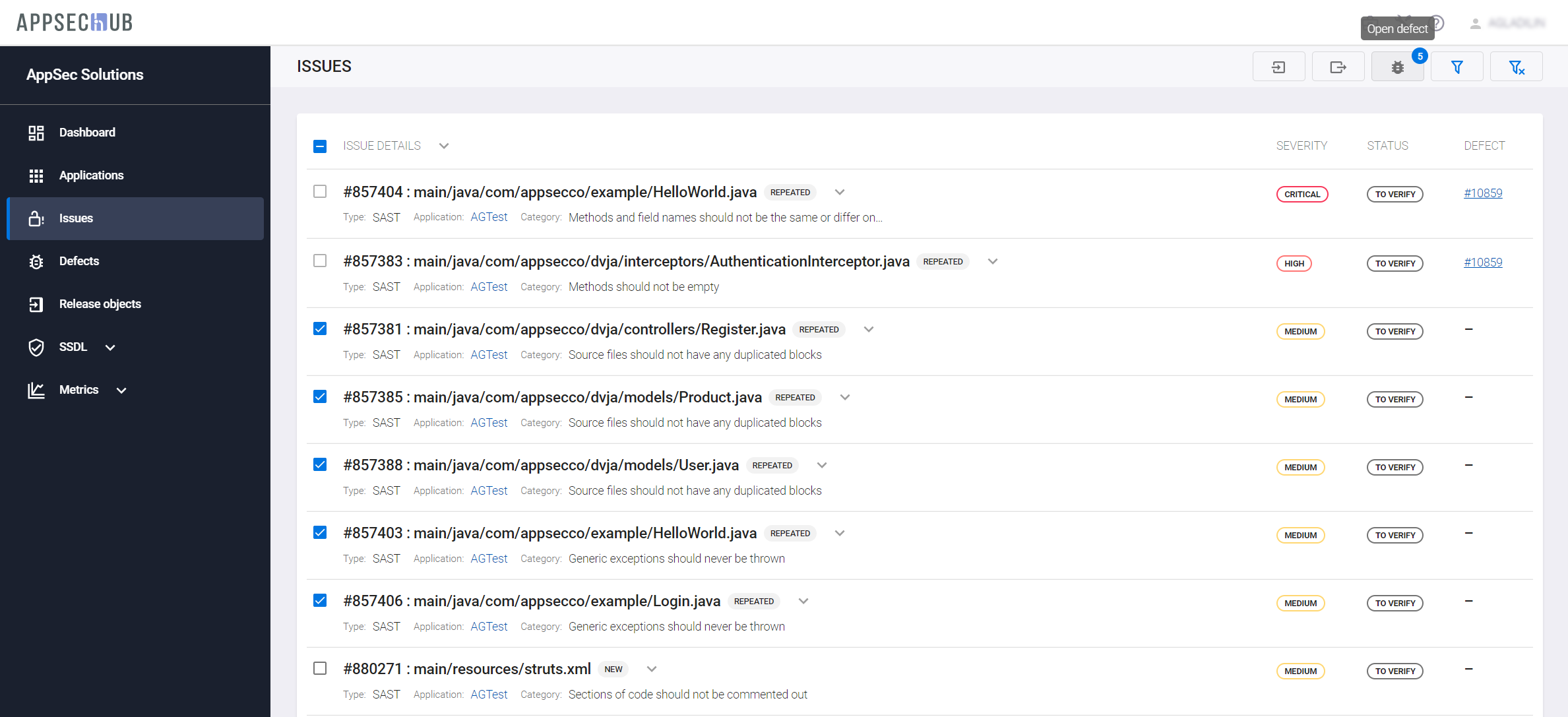 Если будут выбраны проблемы безопасности, относящиеся к разным практикам или приложениям, кнопка Open defect будет неактивна. Для облегчения выбора соответствующих проблем безопасности используйте фильтрацию.