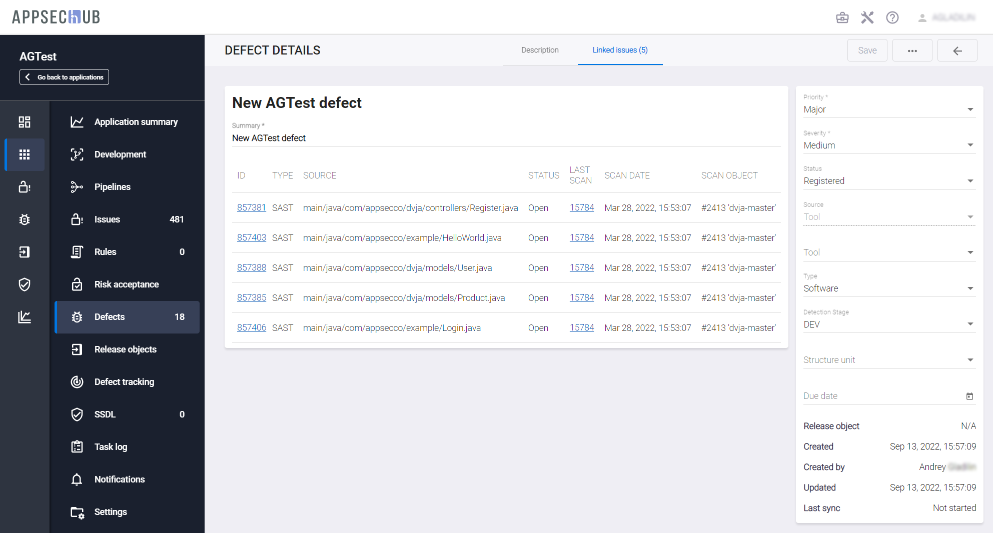 Все связанные с дефектом проблемы безопасности будут переведены в статус Open. Также будет создан новый дефект безопасности со статусом Open. Выберите слева в консоли пункт меню Defects, чтобы увидеть вновь созданный дефект безопасности на странице дефектов приложения.