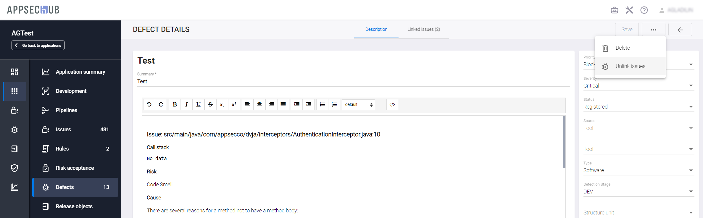 Предусмотрена возможность удаления из дефекта связанных с ним проблем безопасности. Открыв окно дефекта безопасности, нажмите кнопку Actions