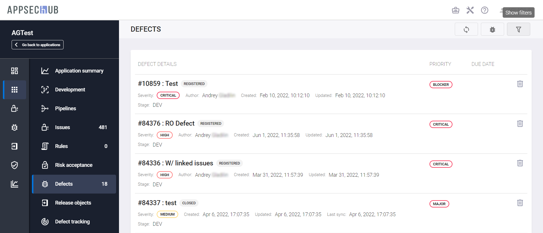 Чтобы синхронизировать дефекты для одного приложения, нажмите пункт меню Applications, выберите приложение, перейдите на страницу Defects и нажмите кнопку Show filters cправа вверху.
