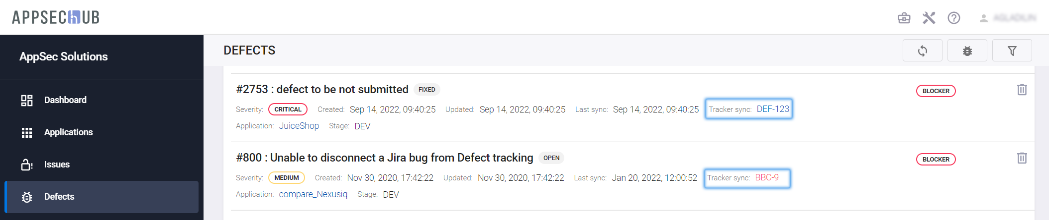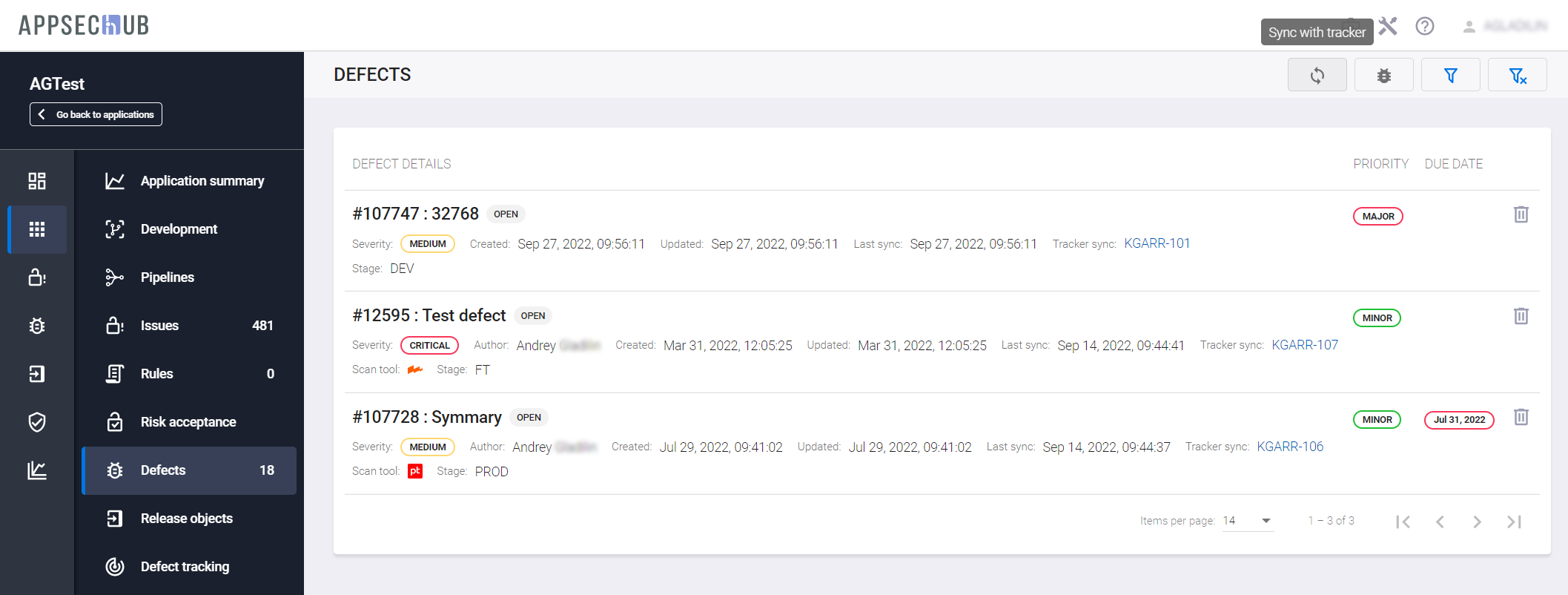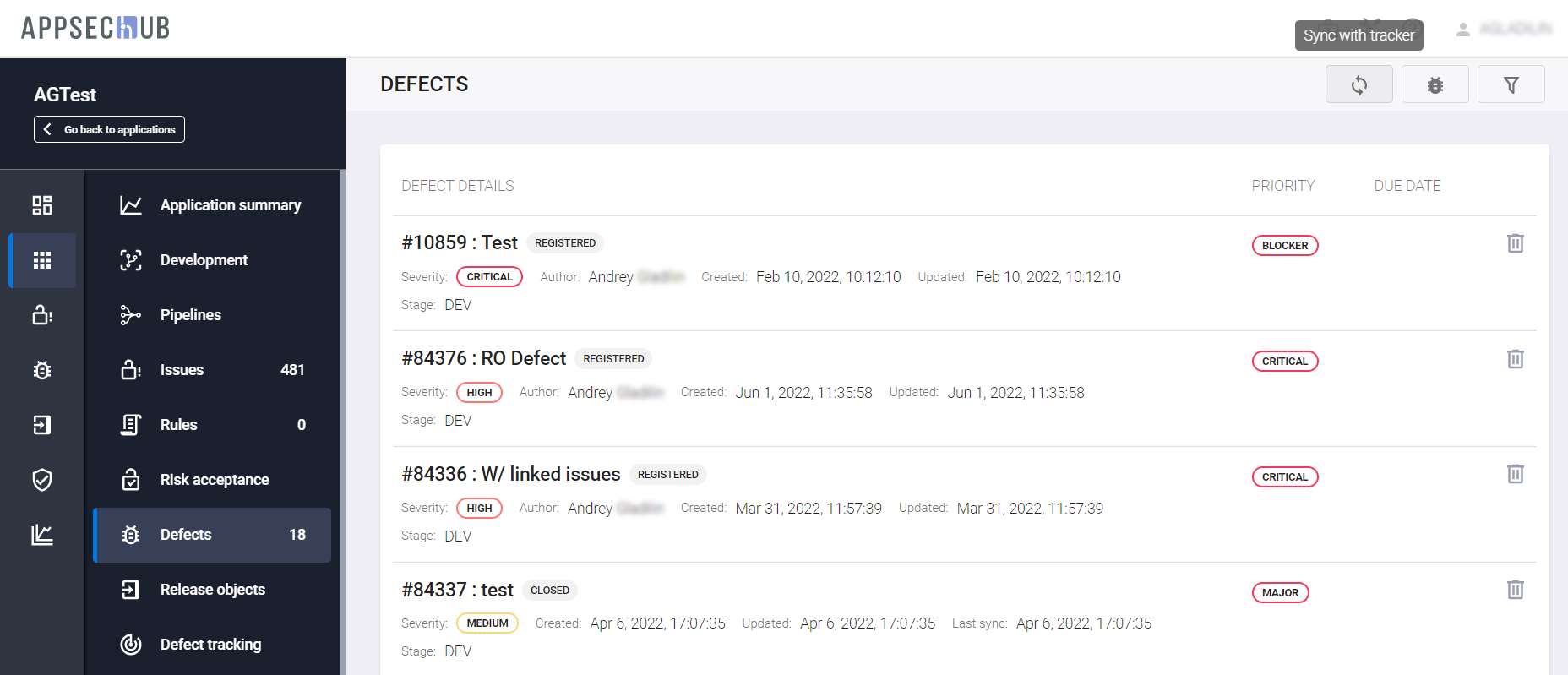 Как было описано в предыдущем разделе, выберите приложение и нажмите пункт меню Defects. На экране появится страница дефектов приложения. Нажмите кнопку Sync with tracker
