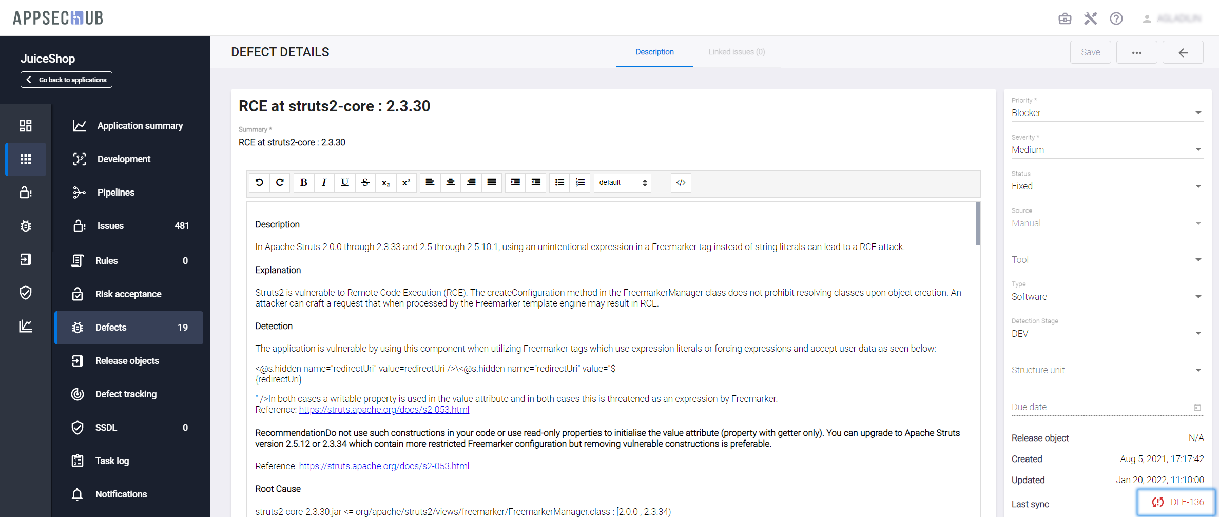 Каждый дефект безопасности должен быть исправлен командой разработчиков приложения. Когда дефект исправлен, разработчики меняют статус дефекта безопасности Jira на Fixed. Теперь дефект необходимо синхронизировать между Jira и AppSec.Hub.