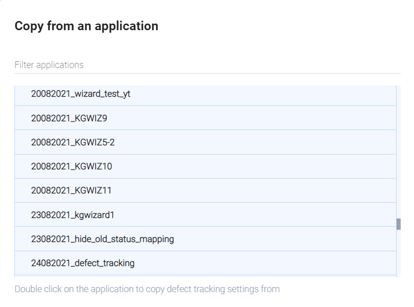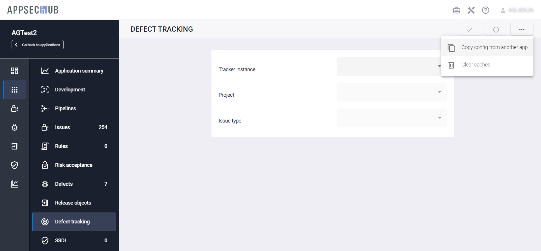 В системе существует возможность просто скопировать все настройки отслеживания дефектов в AppSec.Hub из другого приложения. Для этого на появившейся странице Defect Tracking нажмите кнопку Actions в правом верхнем углу, выберите пункт выпадающего меню Copy config from another app и выберите из выпадающего списка приложение, из которого будут скопированы настройки.
