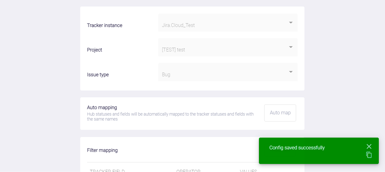 После выполнения автоматического сопоставления статусов и полей нажмите кнопку Update config в правом верхнем углу страницы Defect Tracking, чтобы сохранить созданную конфигурацию.