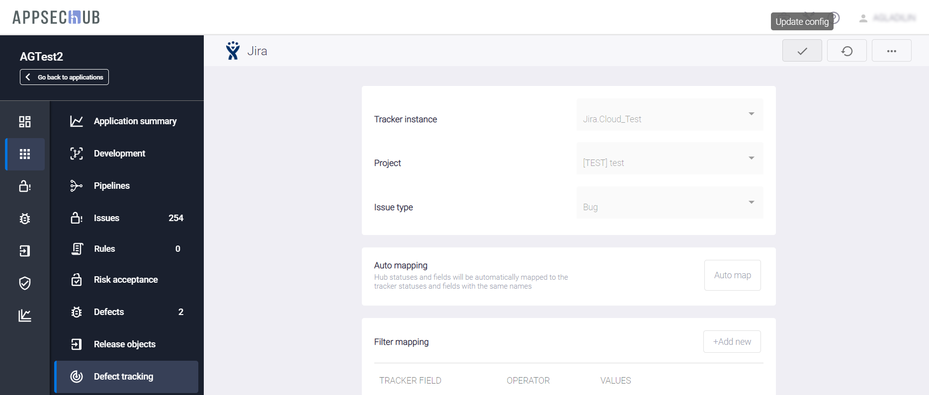 Нажмите кнопку Update config в правом верхнем углу страницы Defect Tracking, чтобы сохранить конфигурацию.