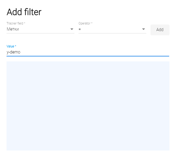 Предположим, что все дефекты безопасности в Jira были помечены меткой y-demo. В таком случае необходимо выбрать значение Labels в выпадающем меню Tracker field, значение = в выпадающем меню Operator, ввести значение y-demo в поле Value и нажать кнопку Add справа. Вновь созданный фильтр появится в окне Add filter.