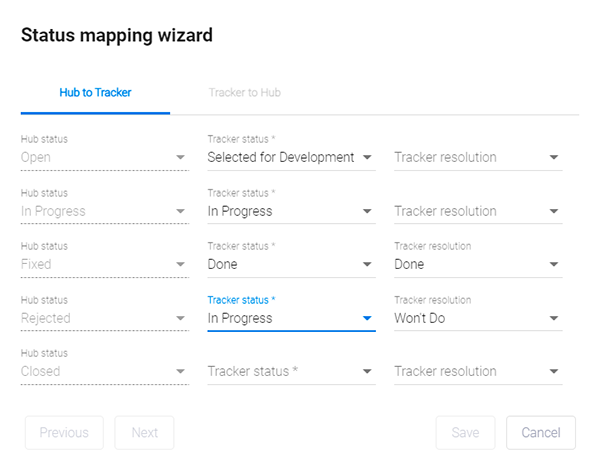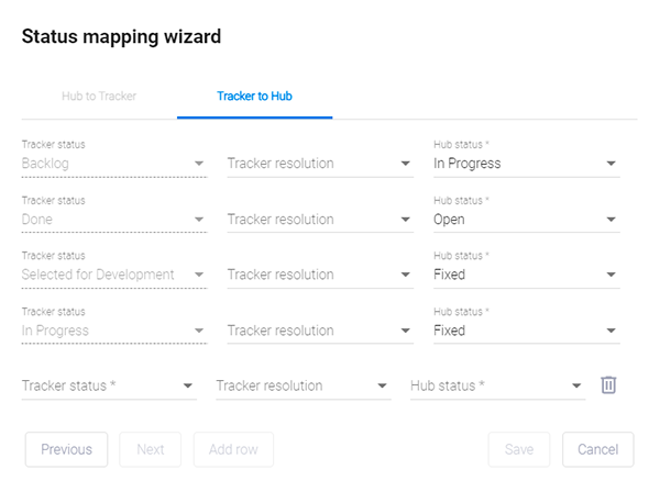 При появлении в системе отслеживания задач нового статуса можно добавить его в таблицу сопоставления статусов, нажав кнопку Add row. Выполнив все необходимые настройки, нажмите кнопку Save. Перечень всех сопоставленных статусов появится в разделе Status mapping wizard. При необходимости можно запустить мастер настройки вновь и повторить сопоставление статусов.