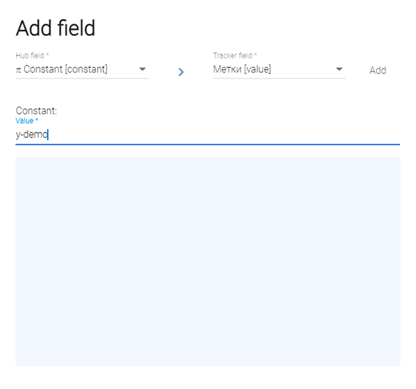 Перед каждой синхронизацией дефектов с Jira необходимо последовательно соблюдать соответствие установленному фильтру и проставлять на все новые дефекты безопасности в AppSec.Hub метку y-demo. Такое действие может быть автоматически задано в настройках в разделе Field mapping на странице Defect Tracking. Нажмите кнопку +Add new и выберите значение Constant в выпадающем меню Hub field, значение Labels [value] в выпадающем меню Tracker field, введите значение y-demo в поле Constant и нажмите кнопку Add справа.