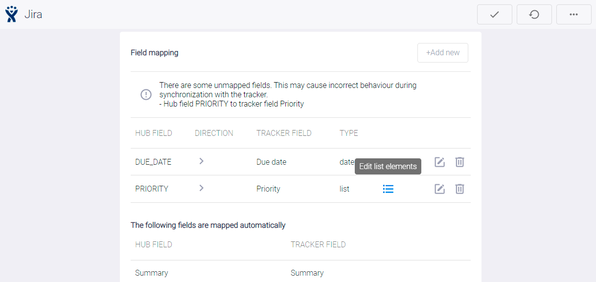 Однако, после создания этого правила сопоставления в секции Field mapping появилось предупреждение о существовании несопоставленных полей и возможном некорректном поведении при синхронизации с Jira. Списки приоритетов дефектов в AppSec.Hub и в проекте Jira часто различаются, и соответствие значений приоритета необходимо сопоставлять отдельно для каждого проекта. Кликните иконку Edit list elements