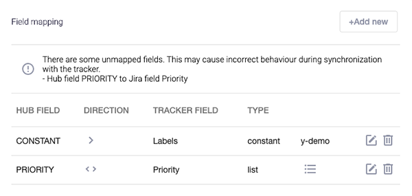 Например, для проекта в Jira требуется определение приоритета дефекта. В этом случае необходимо сопоставить приоритет дефектов в AppSec.Hub с приоритетом дефектов в Jira. Нажмите кнопку +Add new и выберите значение Priority [list] в выпадающем меню Hub field, значение Priority [list] в выпадающем меню Tracker field и нажмите кнопку Add. В результате создастся новое правило сопоставления полей, которое отображается в разделе Field mapping.
