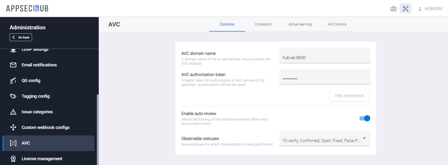 - Enable auto-review — включение автоматического анализа выявленных проблем безопасности после каждого импорта проблем из инструмента AST в AppSec.Hub. Это позволяет автоматически присваивать импортированным проблемам статус «ложно-положительный» (False Positive) или «истинно-положительный» (True Positive). Чтобы получать результаты AVC-анализа (анализа корреляции уязвимостей приложения) и оценку «истинно/ложноположительный» для проблем безопасности SAST, переведите селектор в положение «включено».