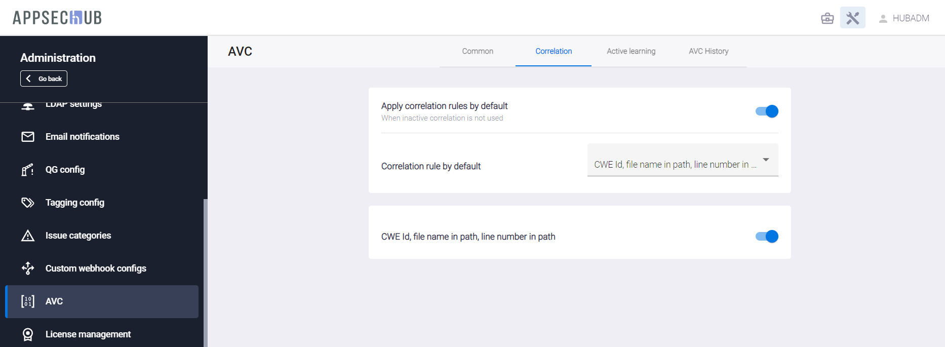 Выберите пункт меню AVC (Application Vulnerabilities Correlation) в меню слева, чтобы обновить настройки корреляции уязвимостей приложения (AVC). Страница AVC содержит четыре вкладки: Common, Correlation, Active learning и AVC History.
