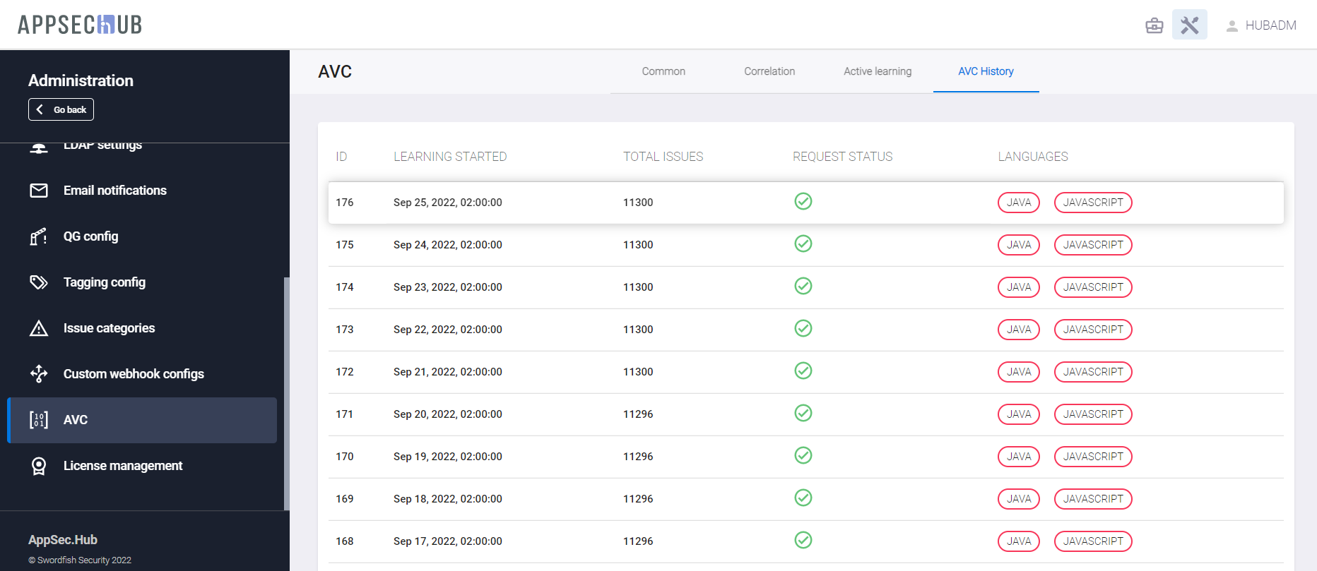 Вкладка AVC History содержит историю изменений настроек AVC-модели с точки зрения обучения (active learning) этой модели. Период тренировки AVC-модели задается в конфигурационном файле app.properties (см. раздел «Приложение 4. Конфигурационный файл app.properties»). По умолчанию, период переобучения составляет одни сутки.
