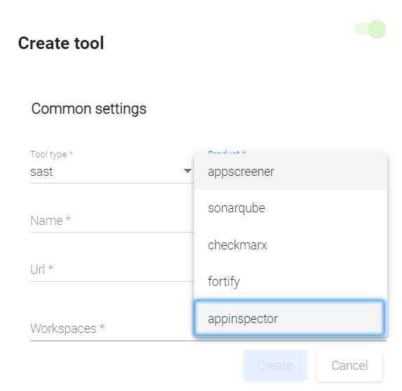 В раскрывающемся меню поля Tool type открывшегося диалогового окна Create tool выберите пункт sast, а в поле Product — appinspector.