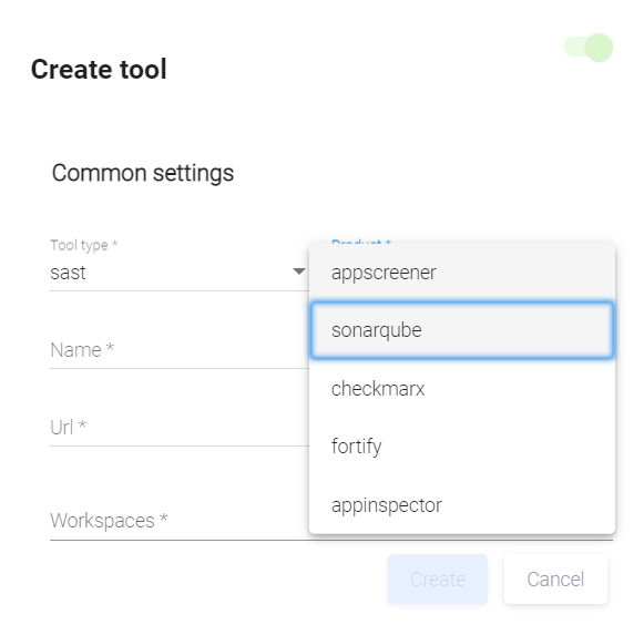 В появившемся окне Create tool выберите элемент sast из выпадающего меню в поле Tool type и элемент checkmarx из выпадающего меню в поле Product.