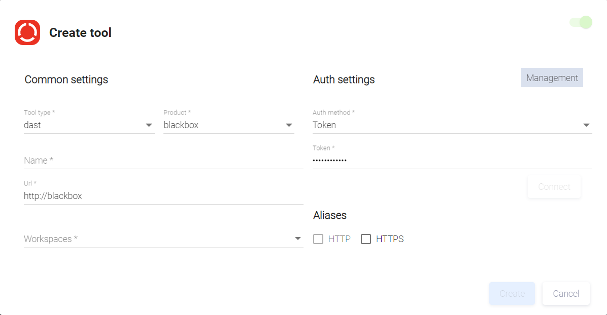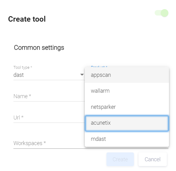 В раскрывающемся меню поля Tool type открывшегося диалогового окна Create tool выберите пункт dast, а в поле Product — acunetix.
