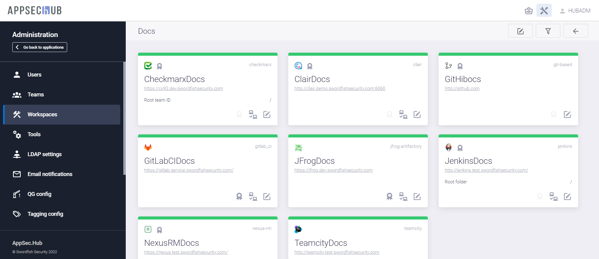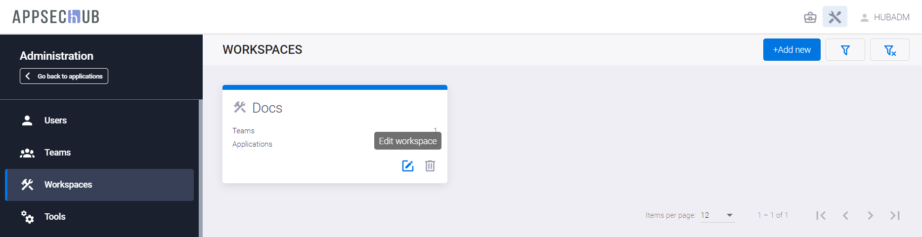 Для создания и настройки рабочих пространств предназначен пункт меню Workspaces в консоли слева. В самом начале работы с AppSec.Hub существует только одно предустановленное рабочее пространство — Default workspace. Все остальные рабочие пространства должны создаваться пользователем с правами Администратора.