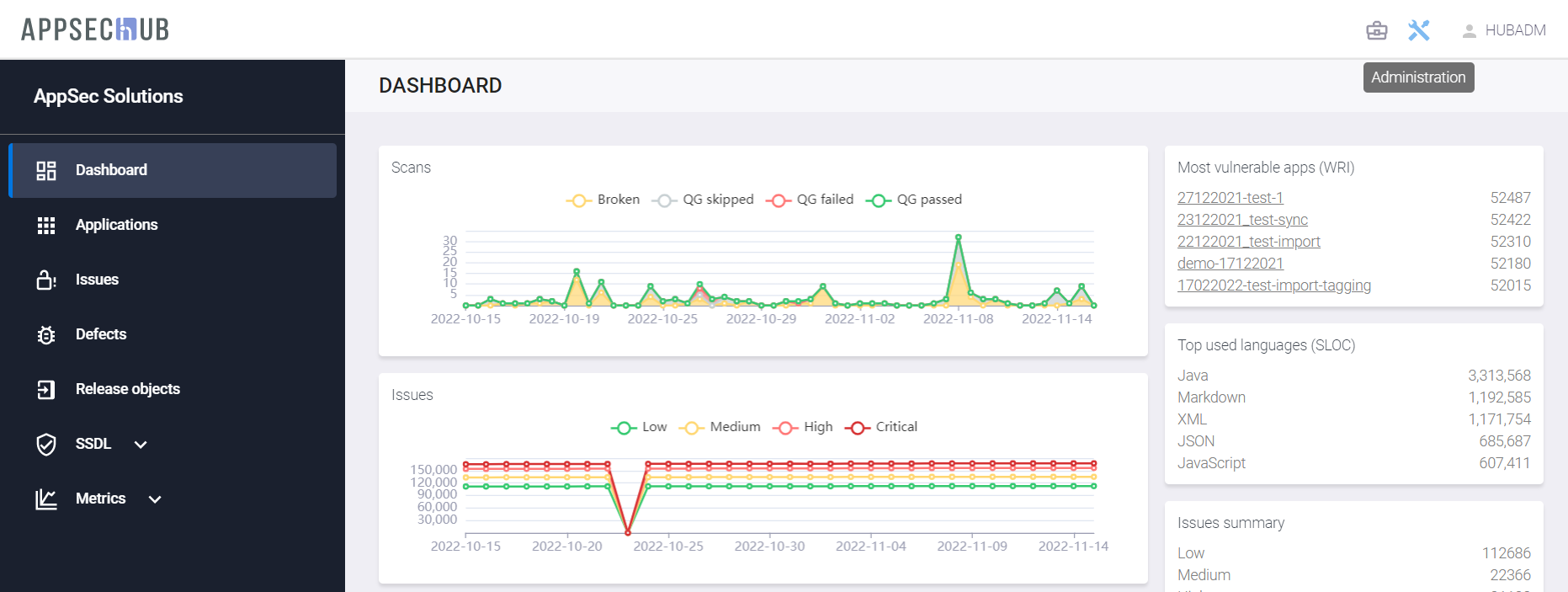 , расположенную в правом верхнем углу пользовательского интерфейса AppSec.Hub, перейдите на страницу администрирования системы.