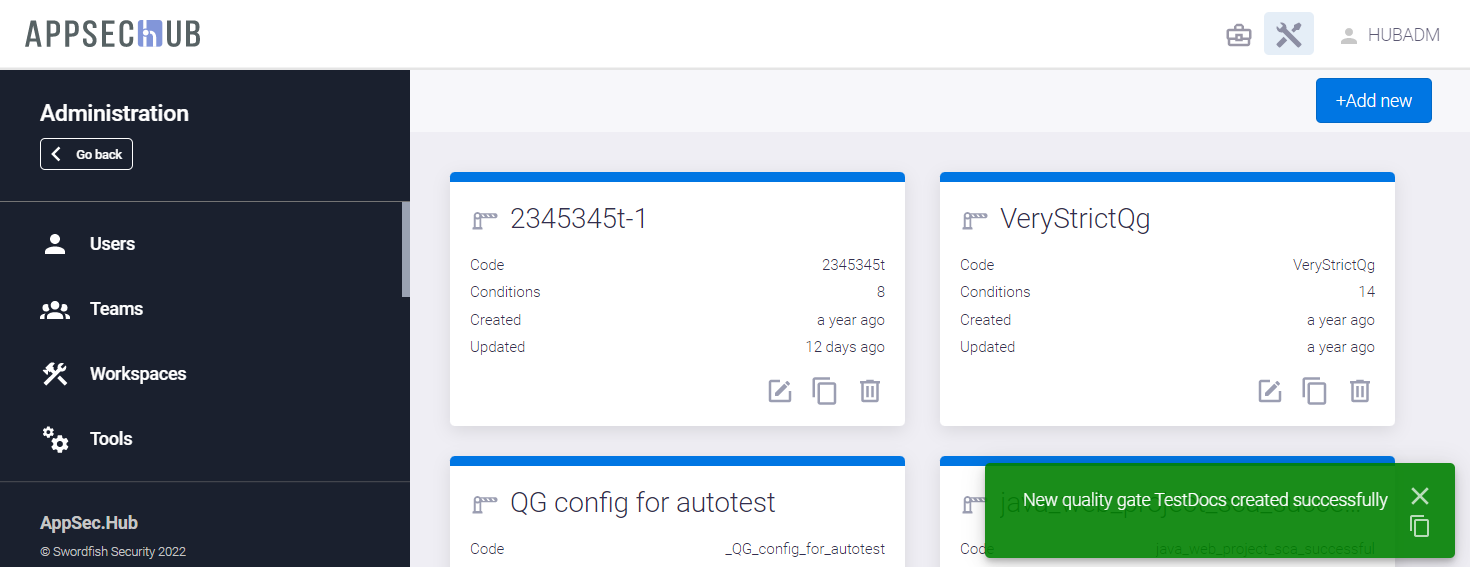 В правом нижнем углу пользовательского интерфейса появится подтверждающее сообщение, а на странице QG Config — карточка соответствующего конфигурационного профиля Quality Gate.