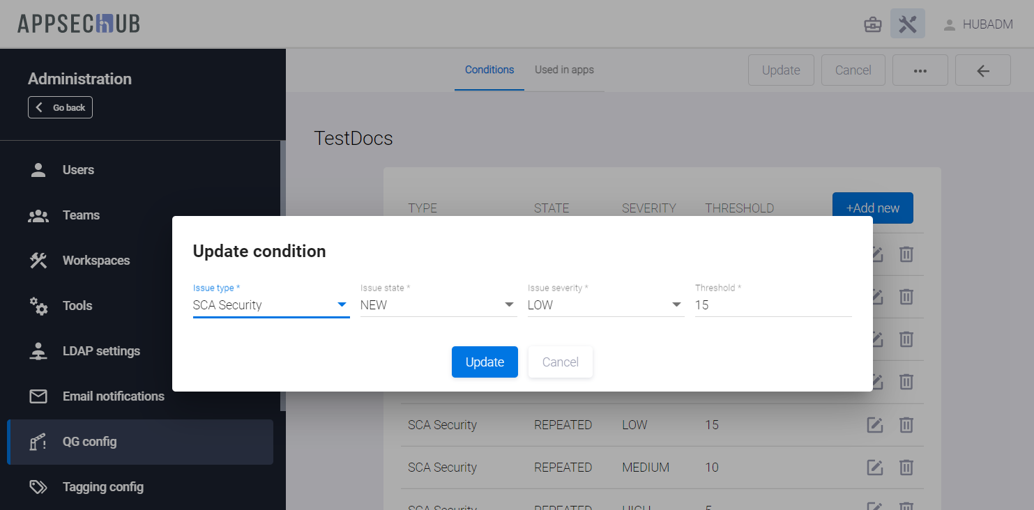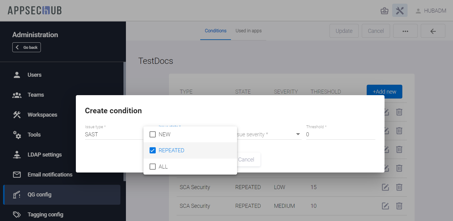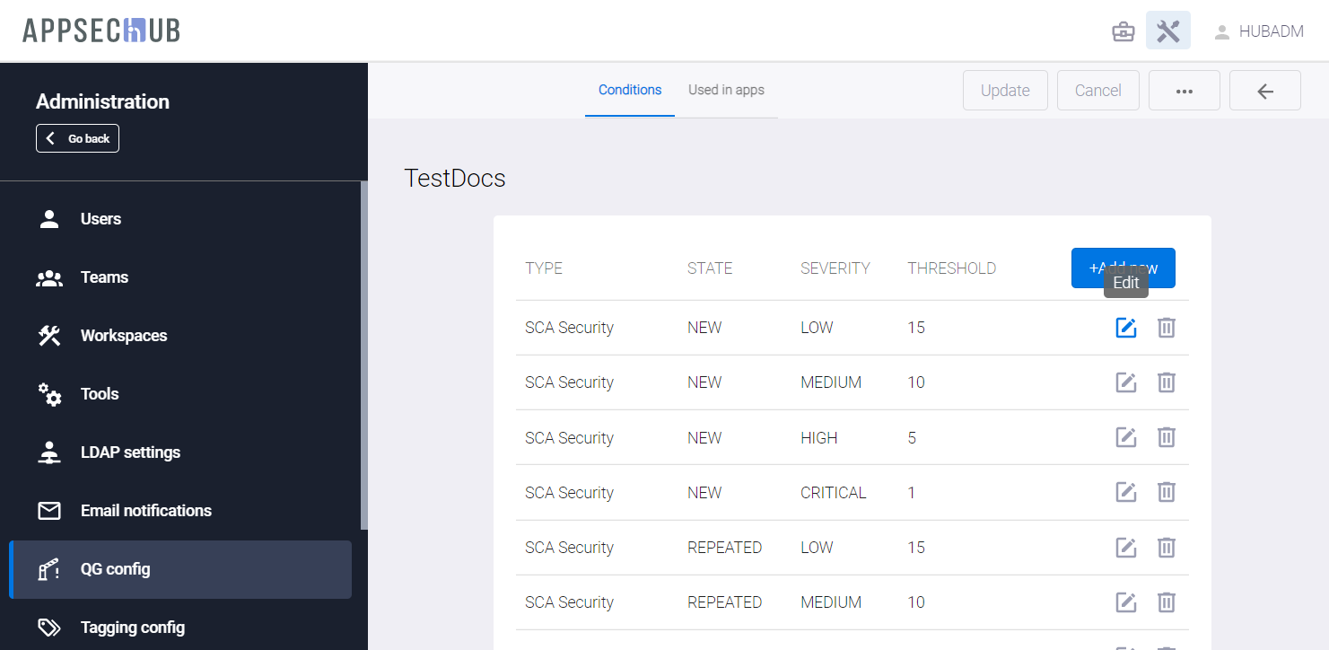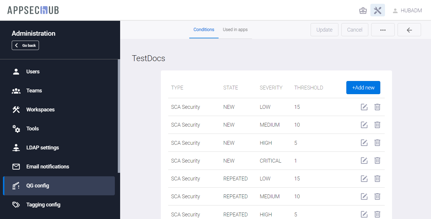 В AppSec.Hub реализовано централизованное управление Quality Gates. На панели администрирования создается определяющий основные критерии конфигурационный профиль Quality Gate, который в дальнейшем может включаться в различные Security Pipelines приложений. Благодаря системному подходу изменение условий профиля приводит к автоматическому и одновременному изменению критериев во всех Security Pipelines, в которых используется данный Quality Gate.