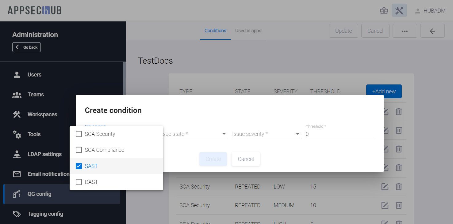 В появившемся диалогом окне в поле Issue type укажите практики AST, для которых определяются условия.