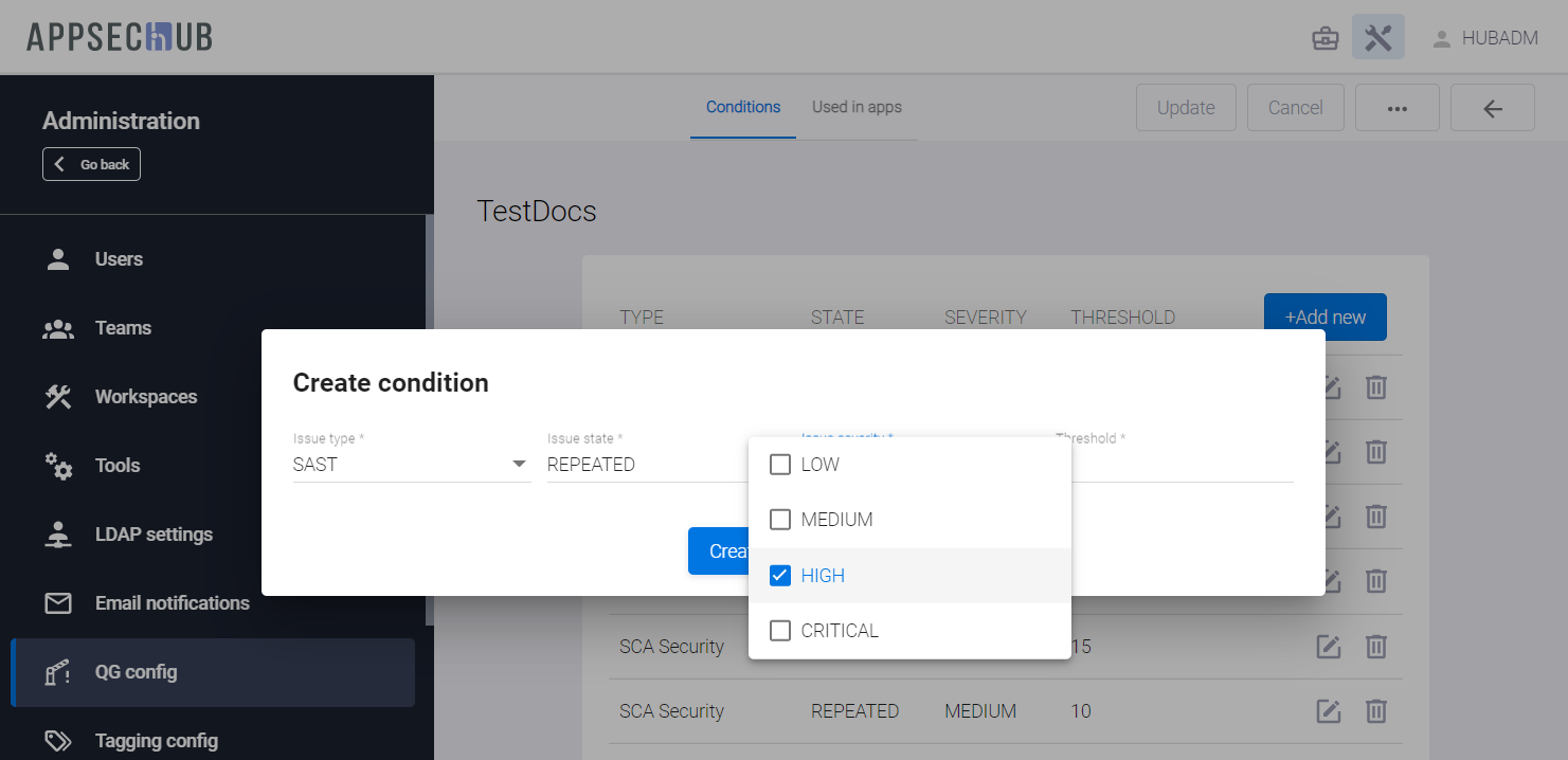 AppSec.Hub позволяет создать и настроить для работы с приложением Quality Gates (QG) и, таким образом, определить критерии качества для приемки результатов сканирования. На основе критериев Quality Gate система решает, успешно ли завершилась работа Security Pipeline или нет. Если критерии QG оказались не выполнены, результат работы Security Pipeline получает статус «failed» («завершившийся неуспешно»). AppSec.Hub возвращает статус «failed» в инструмент CI/CD (TeamCity/Jenkins), и на этом выполнение пайплайна останавливается. Рекомендуется установить различные критерии QG для пайплайнов, предназначенных для целей разработки, тестирования и выпуска релизов, а также просто не устанавливать критерии QG для кода, находящегося в разработке и не включенного в релиз.