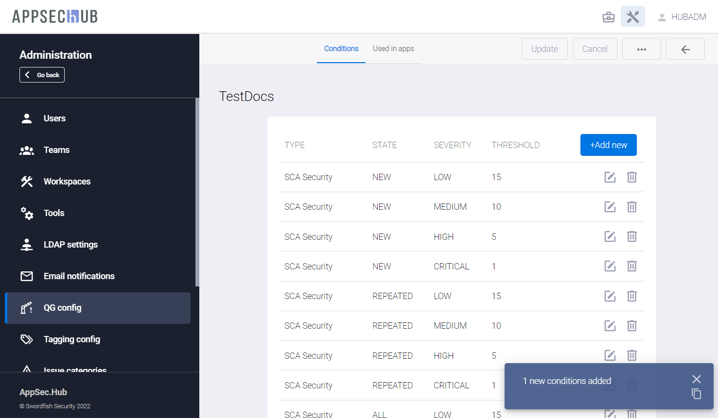 Для добавления в Quality Gate условий перейдите на страницу настройки профиля Quality Gate (см. раздел «Настройка профиля Quality Gate» и нажмите кнопку +Add new.