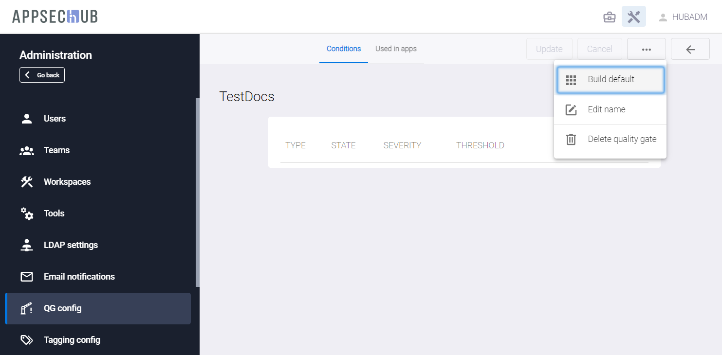 расположенную в правом верхнем углу, и в появившемся раскрывающемся меню выберите пункт Build default. В Quality Gate будут добавлены все возможные условия и Инженеру ИБ останется только отредактировать пороговые значения для нужных условий и удалить ненужные.