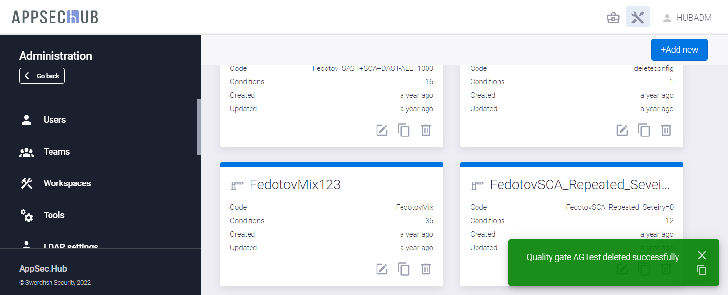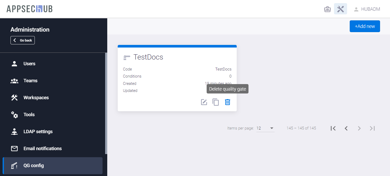 Чтобы удалить профиль Quality Gate, перейдите на страницу QG Config, см. раздел «Создание профиля Quality Gate». В правом нижнем углу карточки Quality Gate нажмите иконку Delete Quality Gate