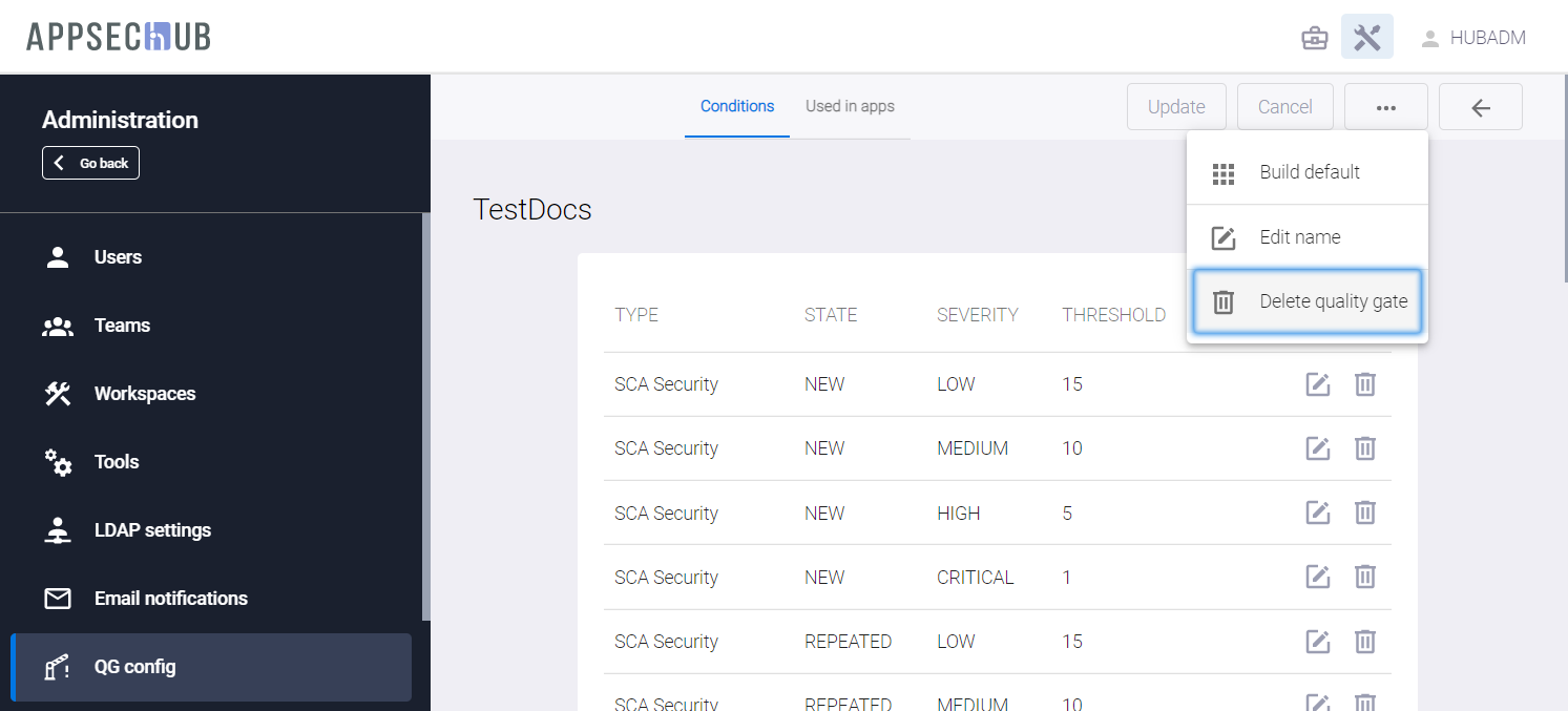 , расположенную в правом верхнем углу пользовательского интерфейса, и в появившемся раскрывающемся меню выберите пункт Delete Quality Gate.