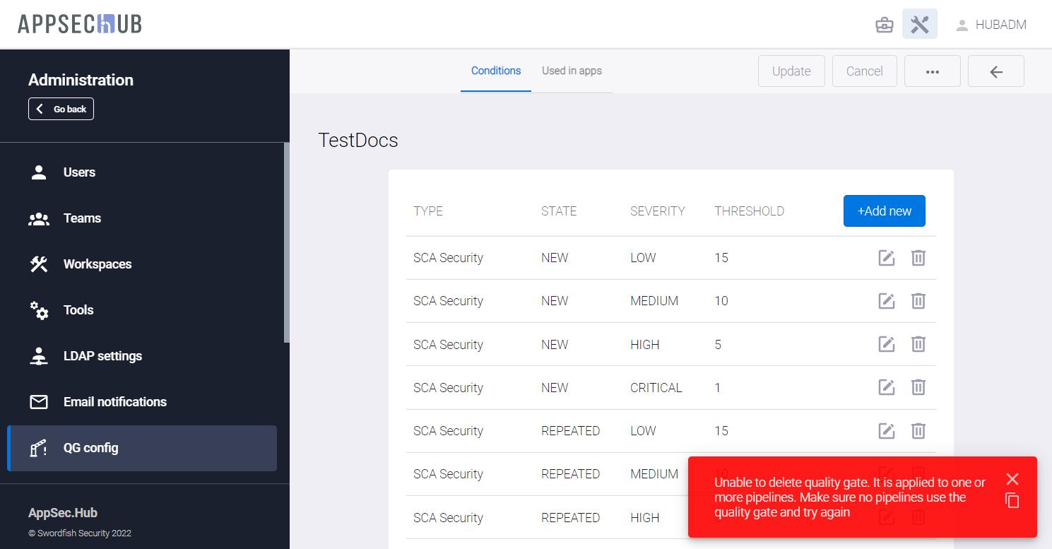 Если предпринимается попытка удаления Quality Gate, который используется в каких-либо Security Pipelines, в правом нижнем углу пользовательского интерфейса отображается соответствующее предупреждение.
