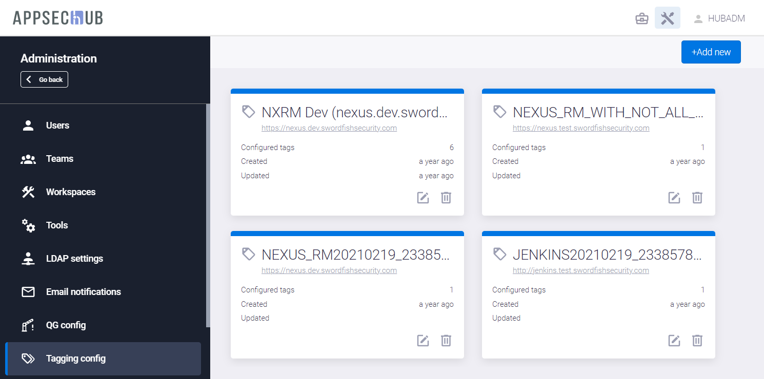 Если на этой странице еще не существует карточек конфигурации тегирования для нужного типа инструмента, нажмите кнопку +Add new в верхнем правом углу страницы Tagging Config, чтобы определить параметры тегирования. На экране появится окно Create tagging config.