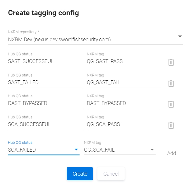Выберите NXRM repository из выпадающего списка и во вновь появившихся полях Hub QG status и NXRM tag попарно сопоставьте статусы QG и теги репозитория. Чтобы сопоставить такую пару, кликните поле Hub QG status и выберите статус QG из выпадающего списка. Затем кликните поле NXRM tag и выберите тег репозитория из выпадающего списка.
