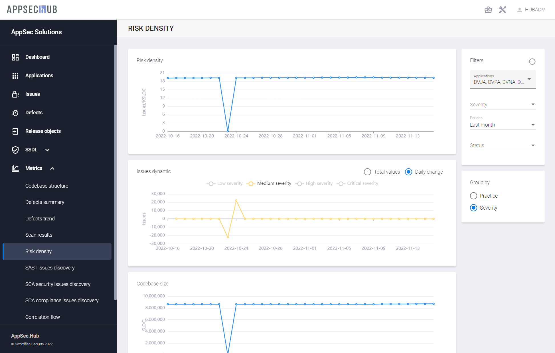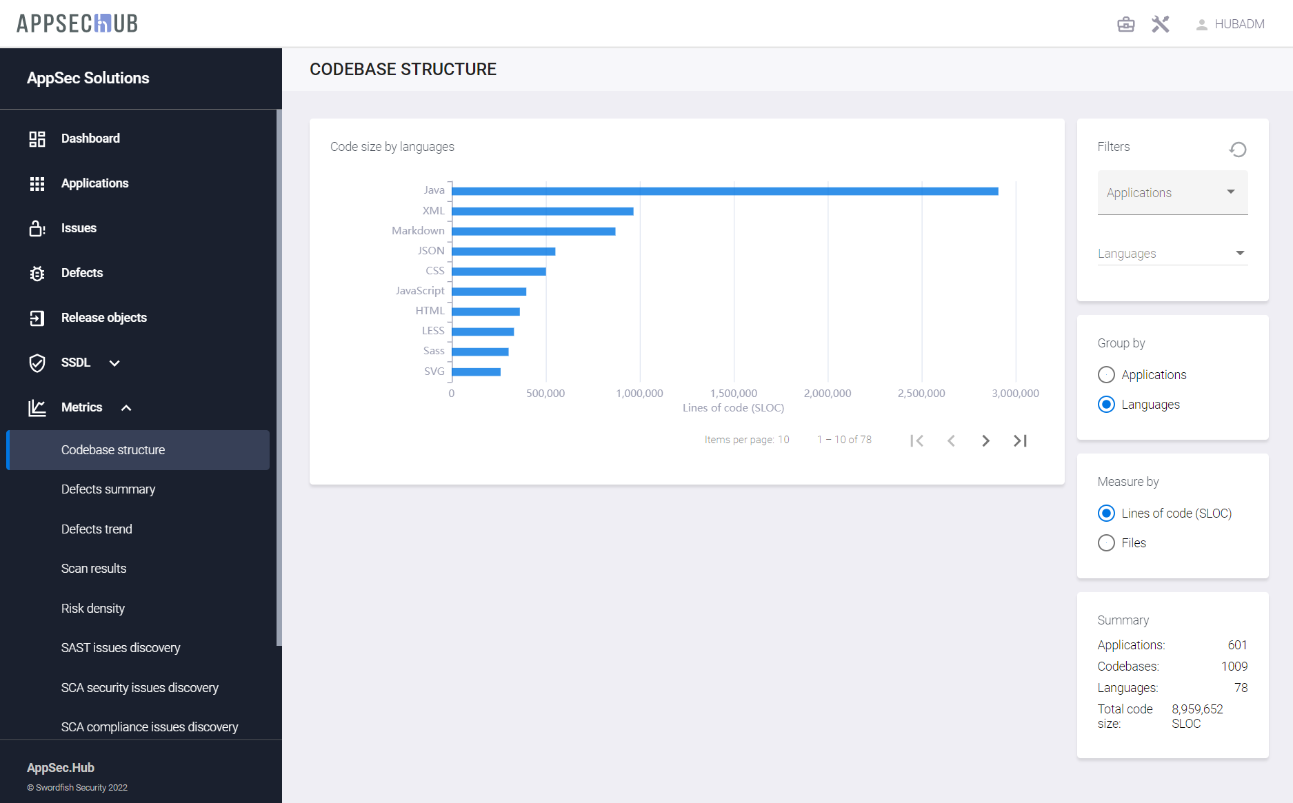 На вкладке Codebase Structure отображены метрики исходного кода для всех приложений в AppSec.Hub, включая: