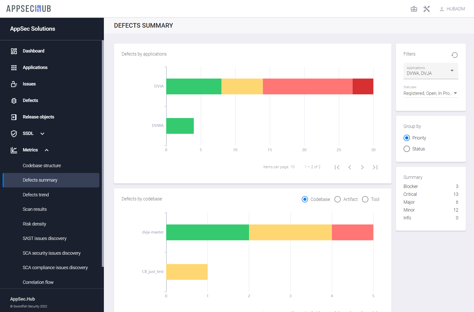 На вкладке Defects summary представлена сводка дефектов с информацией о дефектах безопасности приложений, заведенных на тестируемые приложения, включая:
