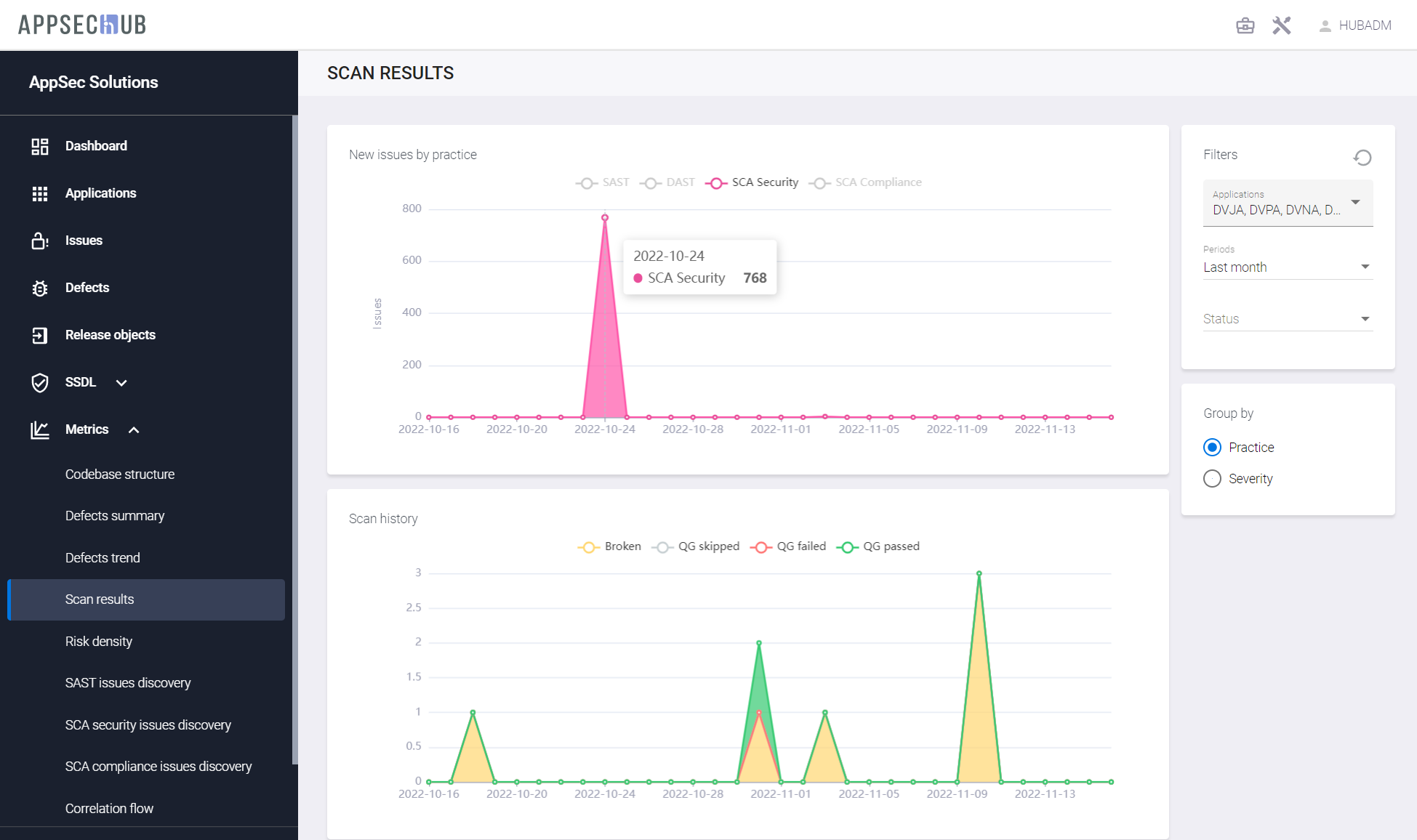 Существует возможность произвести настройку графиков. Чтобы просмотреть новые проблемы по одной или нескольким практикам, выберите пункт Practice в окне Group by и на графике кликните название практики (SAST, DAST, SCA Security, SCA Compliance), чтобы отключить отображение проблем в рамках этой практики. Таким образом, на графике можно оставить, например, только одну практику. В качестве примера на рисунке ниже показаны новые проблемы, найденные в рамках практики SCA Security за последний месяц.