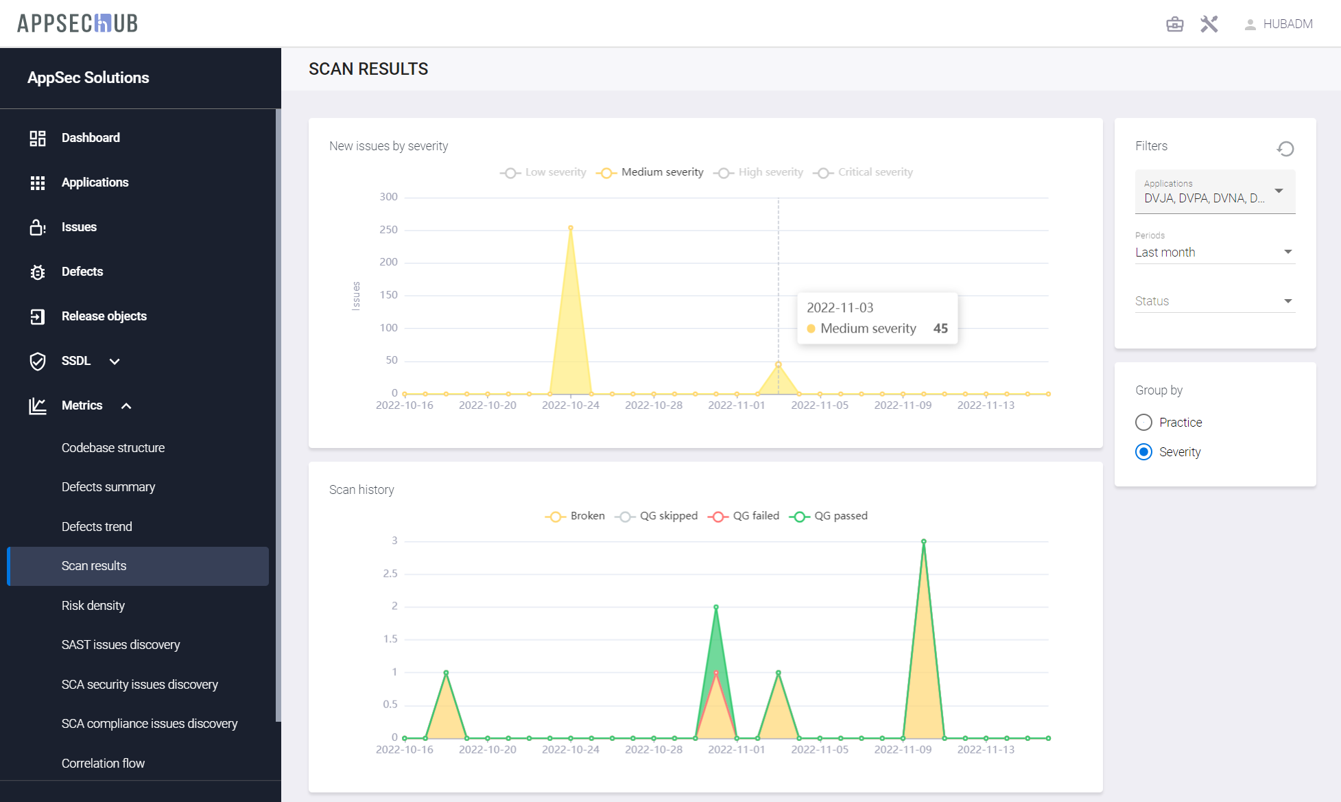 Для работы с метриками на вкладке Scan results обязательным является выбор временного интервала с помощью раскрывающегося меню Periods на вкладке Filters в правом верхнем углу. Можно выбрать интервал от последней недели до последних трех лет. Для выбранного периода времени отображаются следующие показатели.