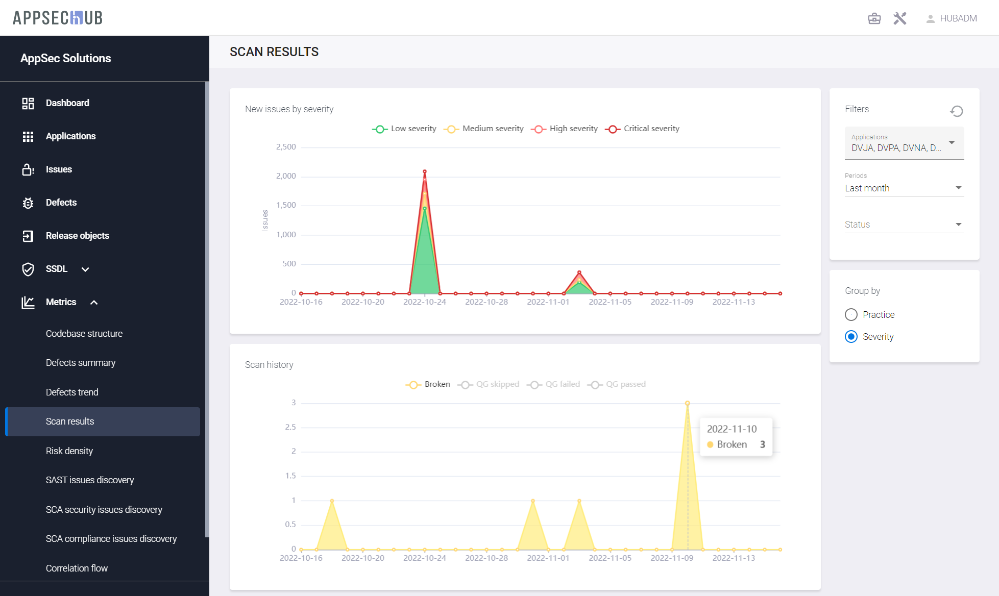 Чтобы получить метрики результатов сканирования для конкретного приложения (приложений), выберите приложение или приложения из выпадающего меню в поле Applications на вкладке Filters в правом верхнем углу.
