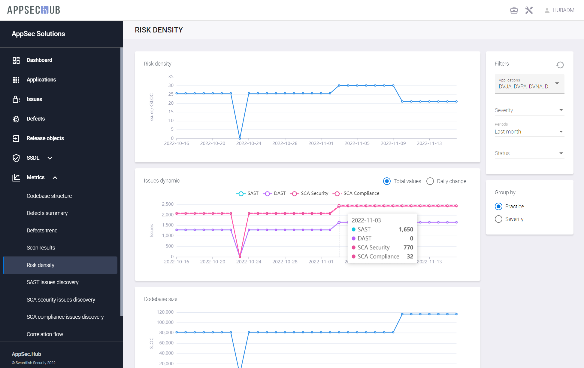 - Найденные проблемы, сгруппированные по практикам (подсчитанные по четырем практикам — SAST, DAST, SCA Security, SCA Compliance), если на вкладке Group by выбран пункт Practice.