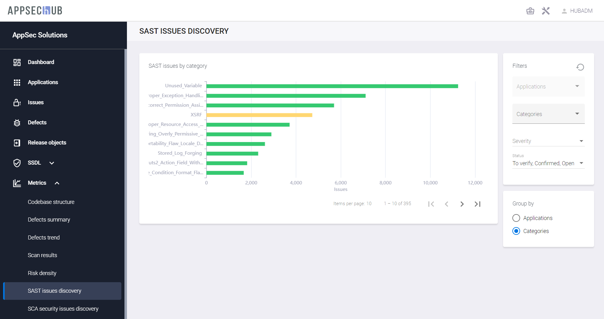 Чтобы получить метрики обнаружения проблем в рамках практики SAST для конкретной категории (категорий), выберите пункт Categories на вкладке Group by и выберите категорию или категории из выпадающего меню в поле Categories на вкладке Filters в правом верхнем углу.