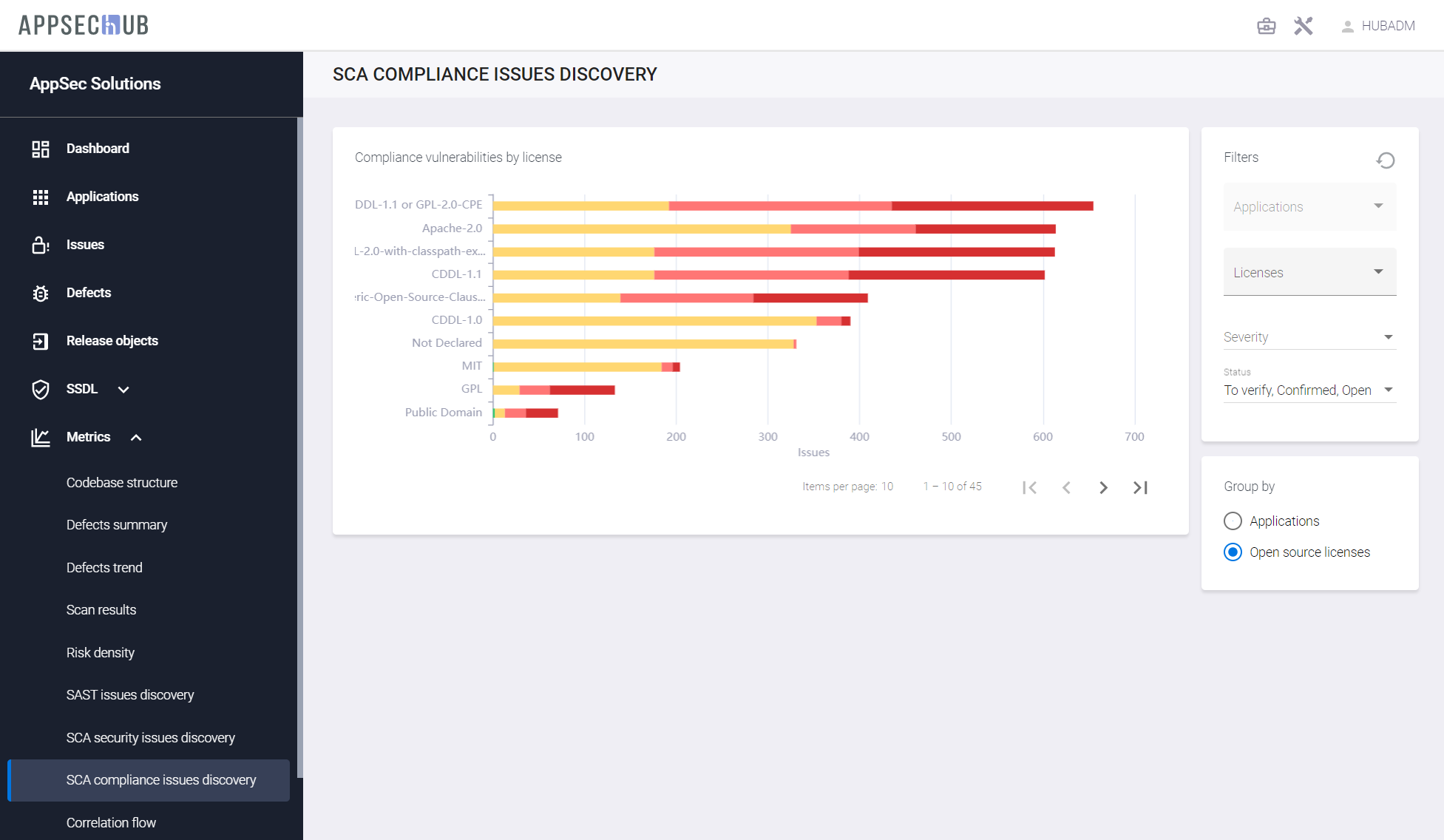 Чтобы получить метрики обнаружения проблем, связанных с корректностью использования лицензий, в рамках практики SCA Compliance для конкретной лицензии (лицензий), выберите пункт Open source licenses на вкладке Group by и выберите лицензию или лицензии из выпадающего меню в поле Licenses на вкладке Filters в правом верхнем углу.