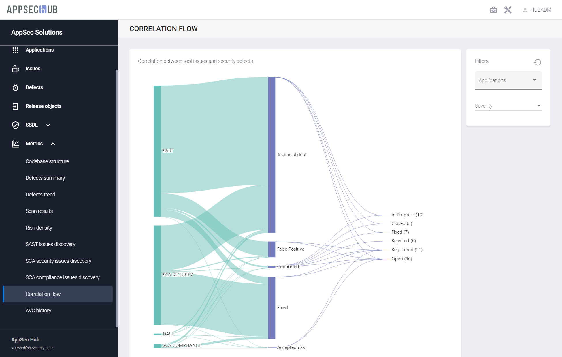 Используйте выпадающее меню в поле Severity на вкладке Filters, чтобы получить метрику Correlation Flow для дефектов безопасности с заданным уровнем серьезности.