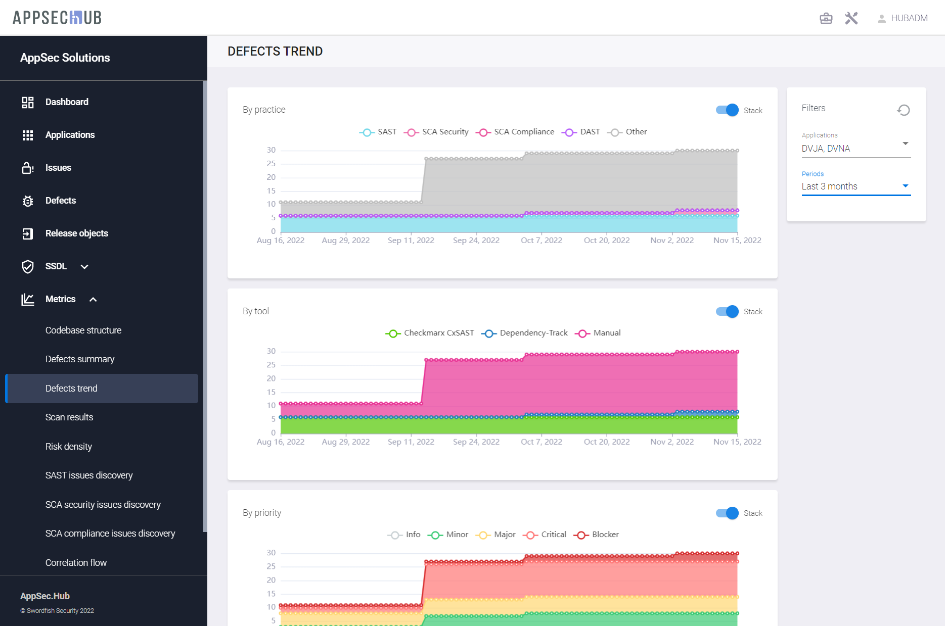 На вкладке Defects trend на нескольких графиках представлена информация о количестве дефектов безопасности приложений с разбиением по нескольким параметрам, включая: