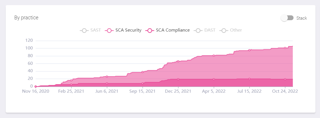 Существует возможность произвести настройку графиков. Чтобы просмотреть дефекты по одной или нескольким практикам, нажмите на графике By practice название практики (SAST, SCA Security, SCA Compliance, DAST или Other), чтобы отключить отображение дефектов, найденных в рамках этой практики. Повторное нажатие добавит обратно отображение этих дефектов. Таким образом, на графике можно оставить, например, только одну практику. В качестве примера на рисунке ниже показаны новые дефекты, найденные в рамках практик SCA Security и SCA Compliance за последние шесть месяцев.