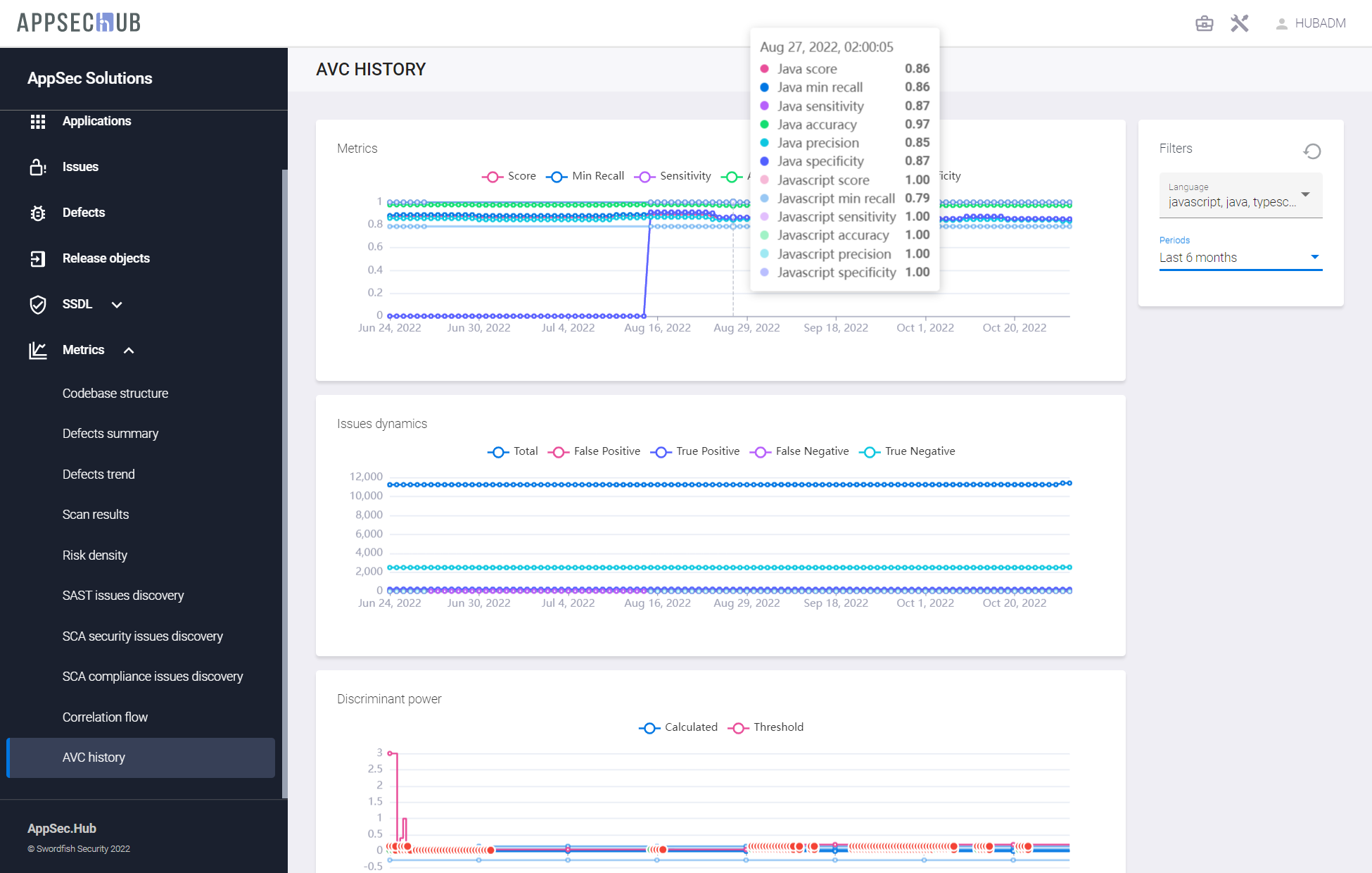 Вкладка AVC History предоставляет данные о параметрах предиктивной модели анализа проблем безопасности AVC (Application Vulnerabilities Correlation) и о показателях качества проведенного AVC-анализа.