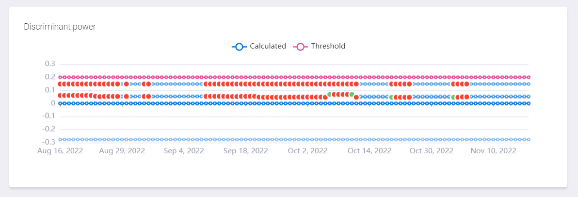 - Calculated — Вычисленное значение комбинированной метрики Discriminant power для AVC-модели. Значение этой метрики может стать триггером для переобучения модели. Зеленая точка на графике означает, что по результатам обучения модель была принята. Красная точка на графике означает, что в результате переобучения модель выдавала либо такой же, либо ухудшенный результат по сравнению с текущей моделью и замены модели не происходило.