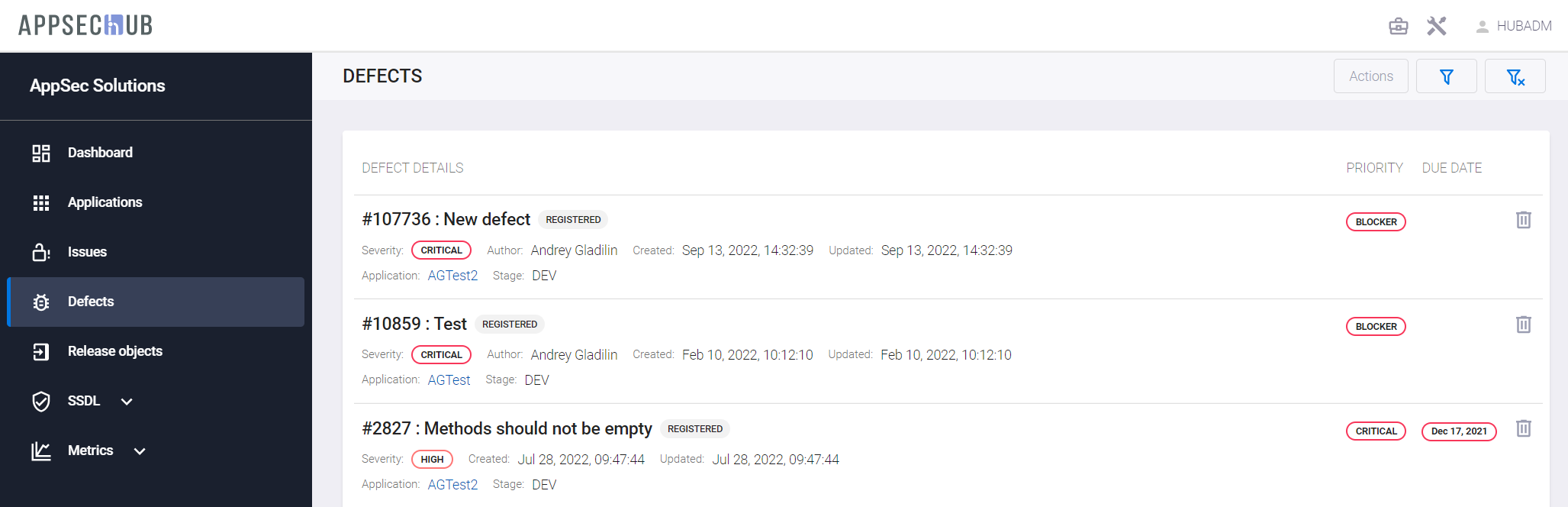 Нажмите кнопку Actions в правом верхнем углу и в выпадающем меню выберите пункт Create defect, чтобы создать новый дефект безопасности.