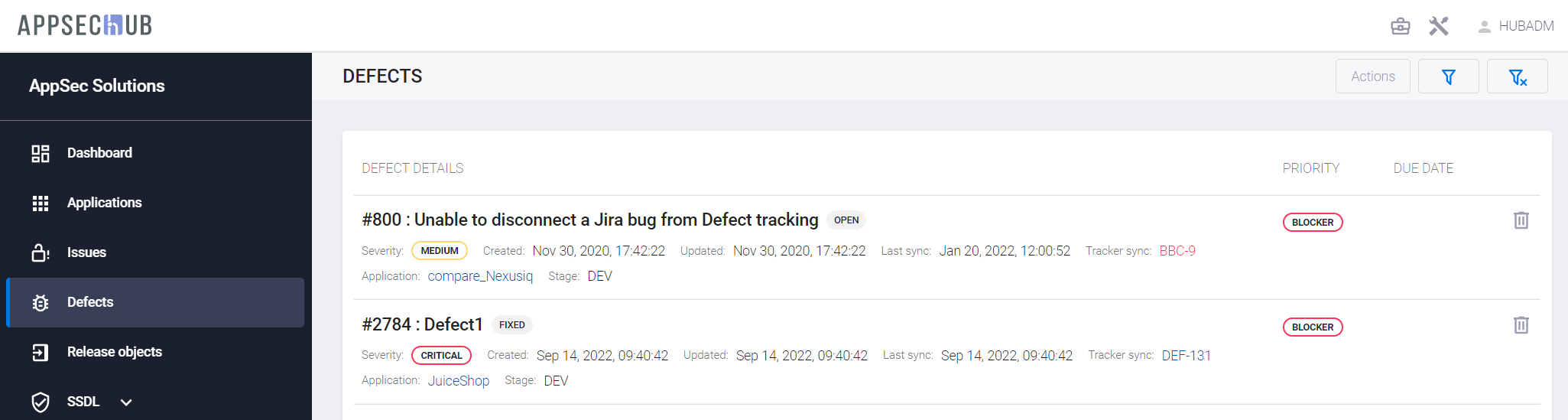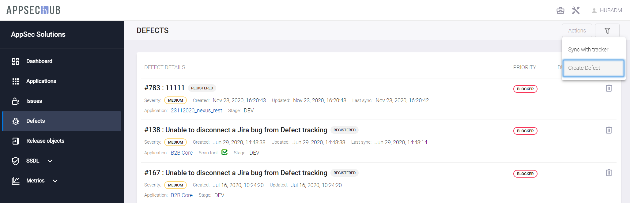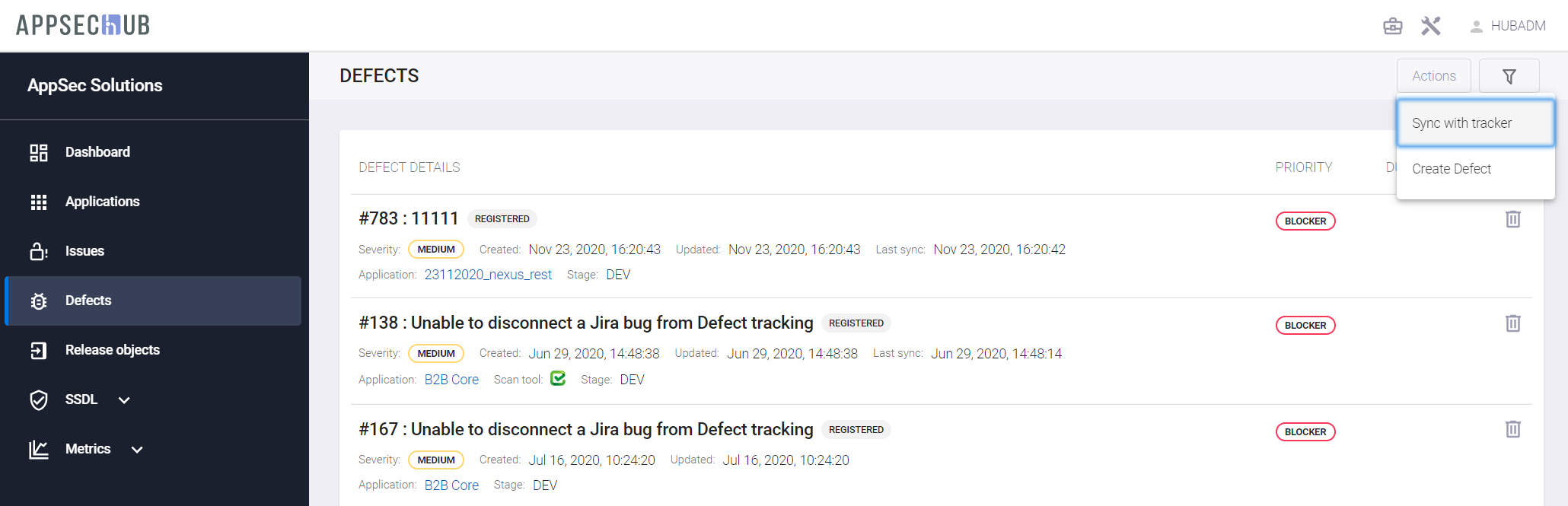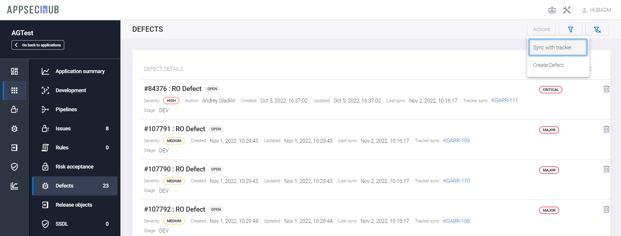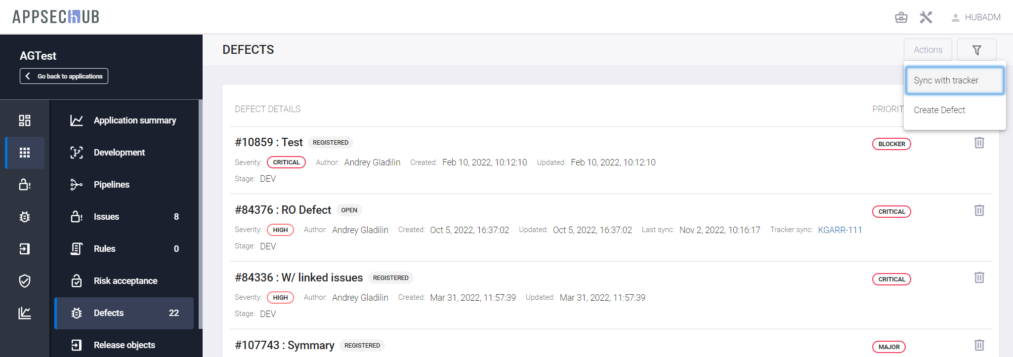 Как было описано в предыдущем разделе, выберите приложение и нажмите пункт меню Defects. На экране появится страница дефектов приложения. Нажмите кнопку Actions в правом верхнем углу и в выпадающем меню выберите пункт Sync with tracker.