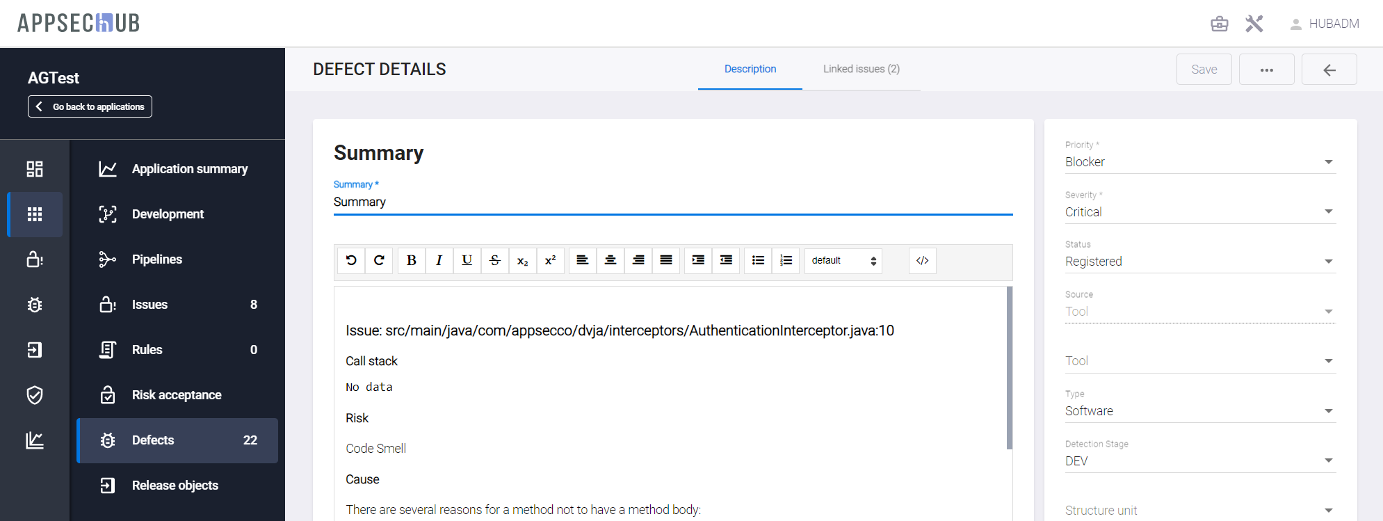 После выбора пункта Create defect на экране появится окно с информацией о создаваемом дефекте. Окно имеет две вкладки: Description и Linked issues. Вкладка Description содержит подробное описание дефекта безопасности, а вкладка Linked issues — перечень связанных с дефектом проблем безопасности с указанием их общего количества.