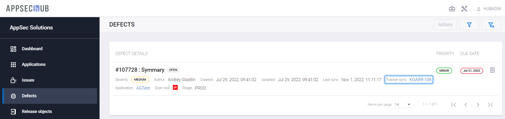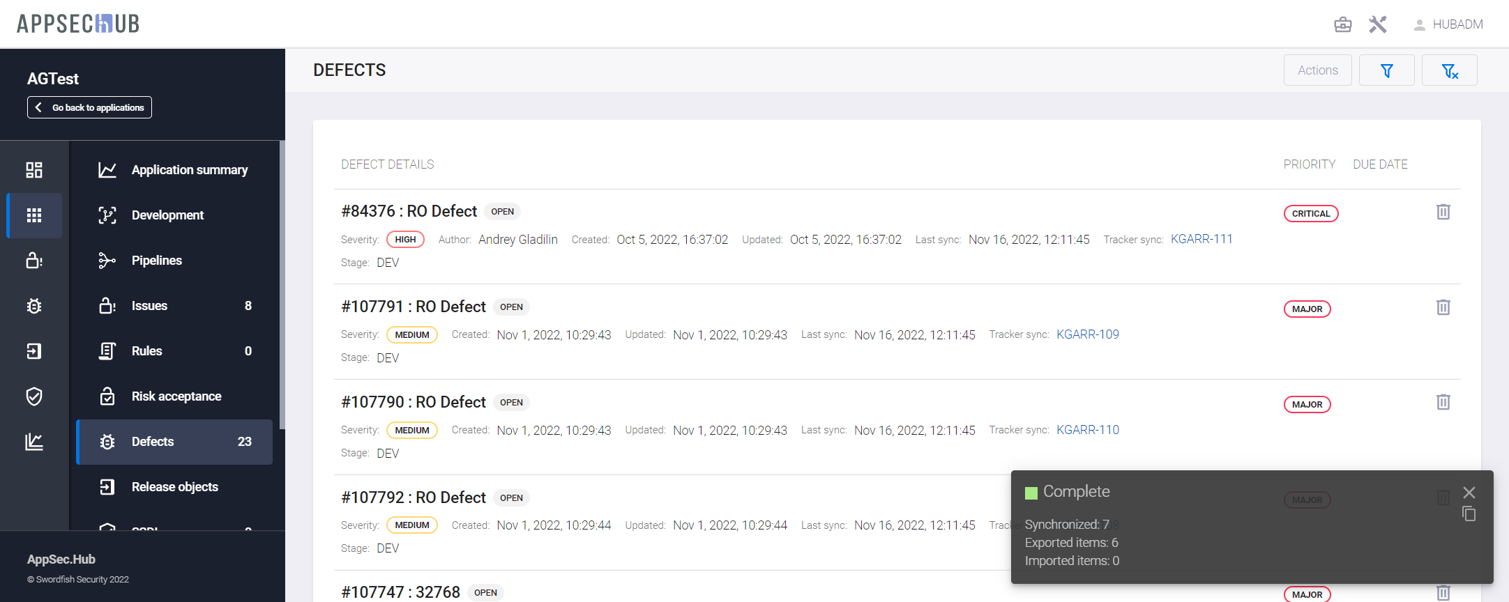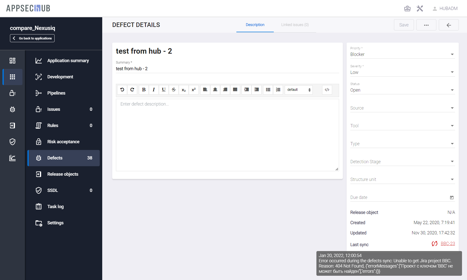Предположим, что в AppSec.Hub был создан или обновлен один или несколько дефектов безопасности. Все вновь созданные или обновленные дефекты безопасности необходимо синхронизировать с проектной системой отслеживания дефектов (Jira или YouTrack).